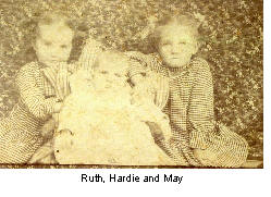 the farm because it possibly meant survival in the agrarian economy of that era. Before we go on, the list of Cain children published in Issue 1 requires correction. Here it is ordered by birth (to the best of our knowledge): Fred Lee Cain, 31 Jul 1887 Minnie Belle Cain, 1888 Willie Monroe Cain, 20 Apr 1890 Lula Etta Cain, 30 Jun 1891 George Kimball Cain, 1893 James Author Cain 1894 Anne Cain, 1895 Rosie May Rebecca, 22 Sep 1900 Ruth Myrtle Cain, 8 Mar 1903 Hardie Allen Cain, 1905 Ada Ester Cain, 10 Aug 1907 Jessie Gertrude Cain, 2 May 1910 Bessie Adeline Cain, 17 Jul 1914 Two unnamed infant sons, birth and death dates also unknown (believed to have been still-born). The previously published list omitted the still-born because there was confusion about them actually being born or miscarried. And we simply didn’t know or had forgotten about James Author. George Kimball Cain, 1893 to 1911, was approximately 18 years old when he died of swamp fever. Dorland’s Medical Dictionary gives three different types of swamp fever - mud fever, quine infectious anemia and malaria. Jessie speculates that Georgie’s “swamp fever” was malarial. She can remember her sister Rosie May Rebecca (May Ward) saying that Mary Lou Belle came home one day and said, “Oh, Georgie has swamp fever again,” which she surmised because of seeing the bottle of turpentine on the table (the treatment at the time). Jessie also remembers May talking about how much she loved Georgie; evidently he must have paid special attention to her, perhaps because there were two children who died very young before May was born. There is a small headstone for Georgie at Ware’s Chapel Cemetery, placed by Ruth and Ada; the dates are probably estimated. James Author Cain was born 4 Nov 1894 and died 8 Dec 1894, cause of death unknown. There is a unique tombstone for James; it is very old and probably was placed by Mary Lou Belle and Alan at the time of his death.
